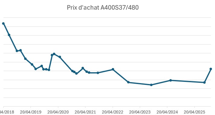 Hausse comparable sur le stockage, nous avons comparé nos prix d’achat sur un des produits que nous avons commandé le plus souvent, et qui existe depuis très longtemps: le disque SSD Kingston A400 480Go. Enormément vendu par le passé pour upgrader des anciens PC, nous en commandons depuis 2018. Sur le long terme les prix ont baissé, mais sur les 3 derniers mois notre prix d’achat a augmenté de 56%. Toutefois les prix sont inférieurs au niveau constaté pendant la crise du COVID.